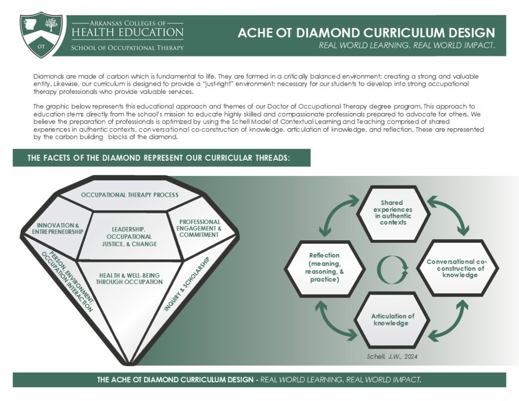 Like diamonds formed under the right conditions, our curriculum creates a “just-right” environment that shapes students into strong, valuable occupational therapy professionals. Rooted in our mission, we use the Schell Model of Contextual Learning to support learning through authentic experiences, collaboration, and reflection. These elements mirror the carbon building blocks that form a diamond—strong, connected, and purposeful.
